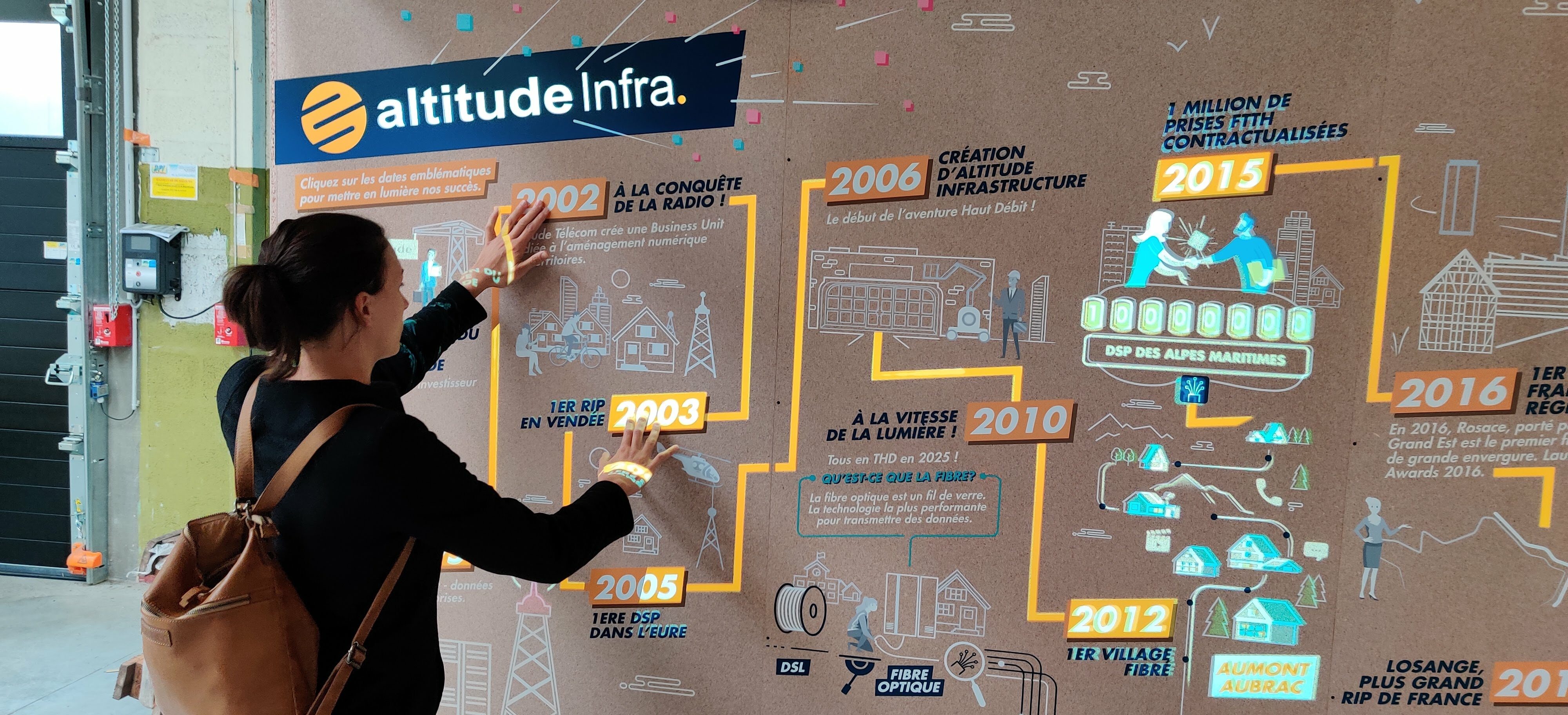 L’enjeu était donc de concevoir une expérience qui permette aux visiteurs – clients, partenaires ou collaborateurs – de s’approprier l’histoire d’Altitude Infrastructure à travers un dispositif interactif à fort pouvoir d’attraction, capable de refléter la dimension humaine, stratégique et innovante du groupe.