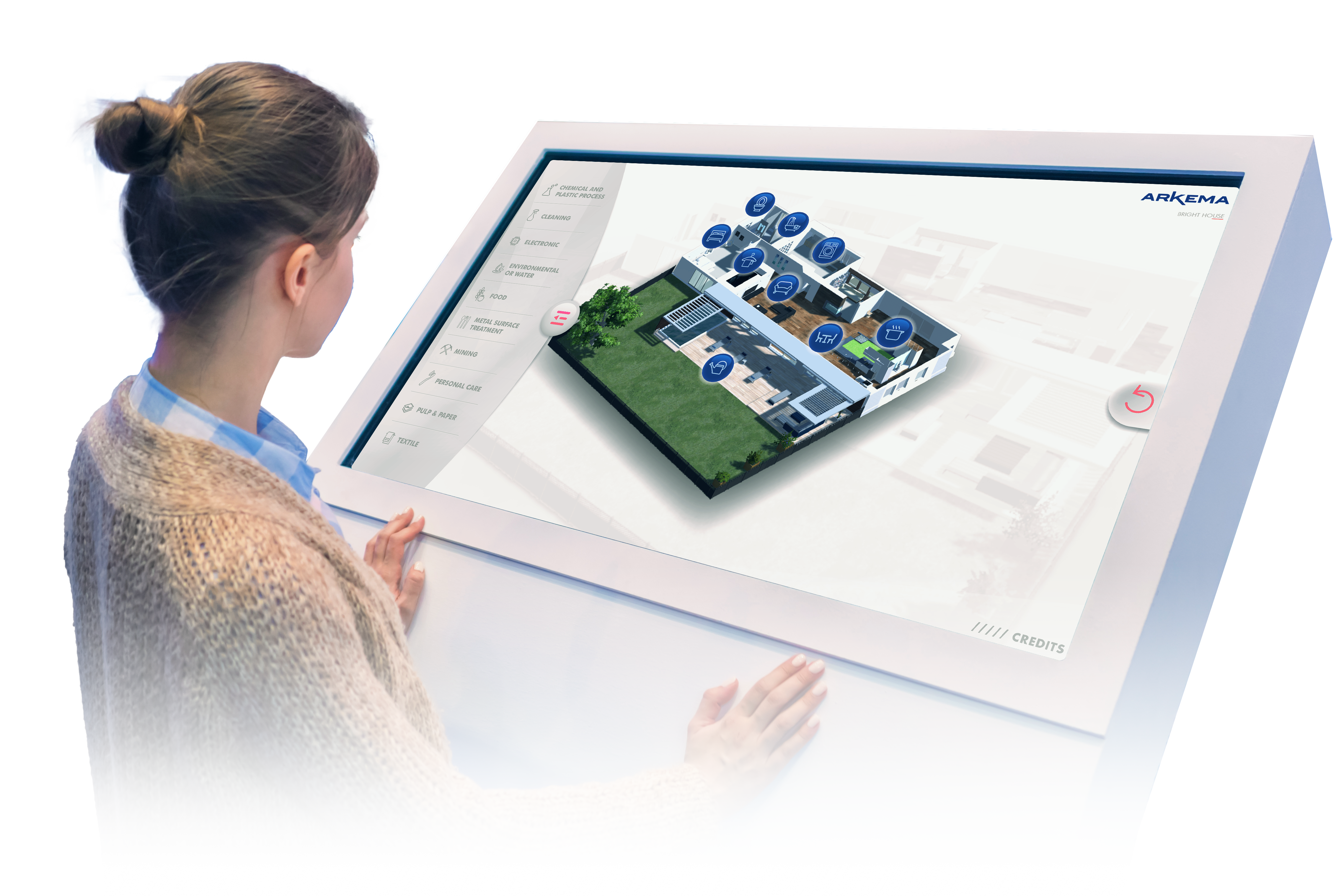 Pour accompagner Arkema dans la valorisation de ses matériaux innovants, nous avons conçu un dispositif multimédia interactif sous forme de table tactile immersive. Ce support permet aux utilisateurs de naviguer dans un environnement 3D réaliste représentant une maison, afin d’explorer les nombreuses applications concrètes des matériaux développés par Arkema. Grâce à notre expertise en conception éditoriale, UX/UI design, modélisation 3D et développement temps réel, nous avons créé une expérience fluide, visuelle et intuitive, capable de traduire des contenus techniques en une démonstration accessible, pédagogique et engageante. Ce projet illustre notre capacité à transformer une offre complexe en une expérience interactive à forte valeur ajoutée, au service de la communication institutionnelle et de l’innovation produit.