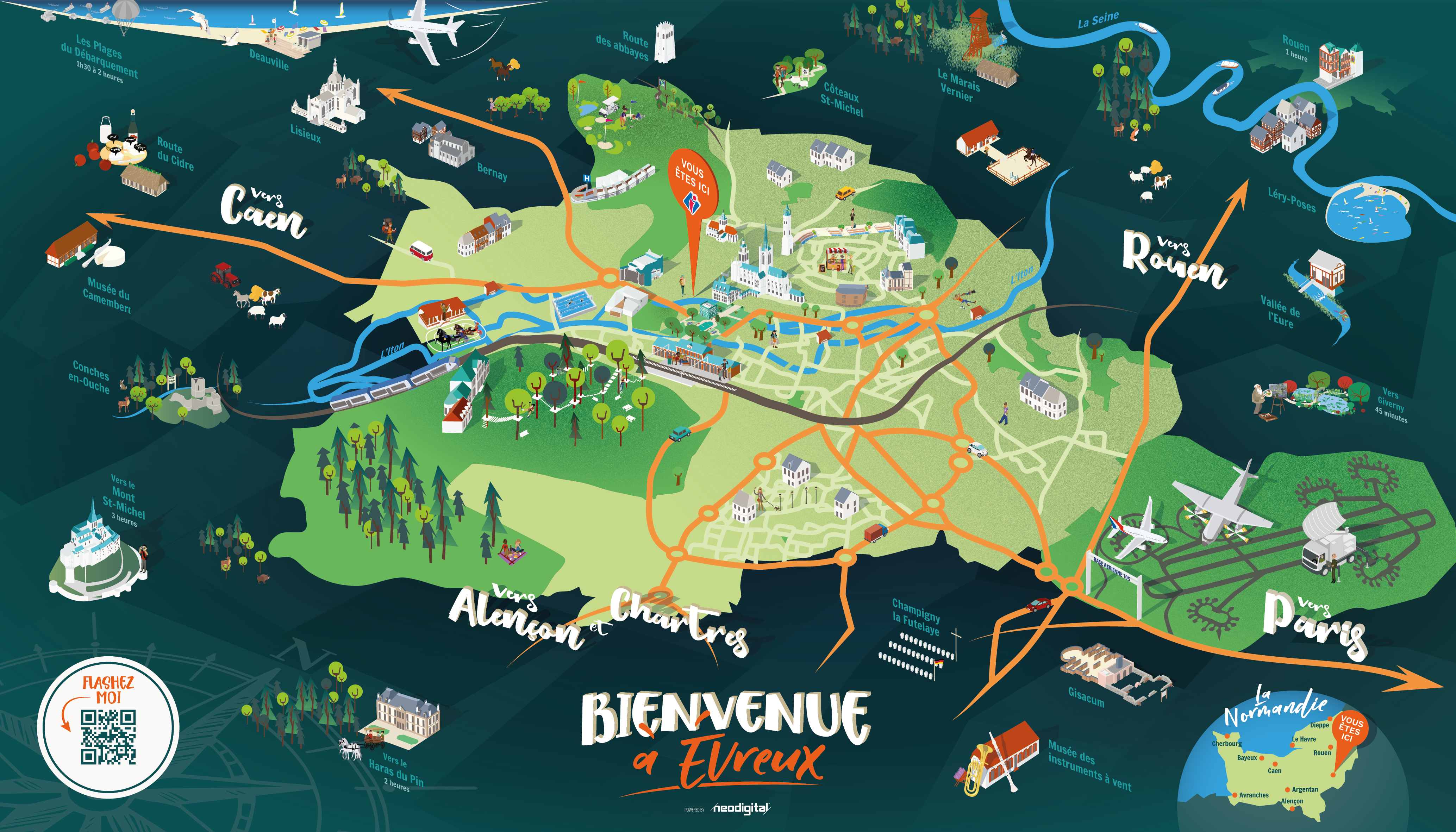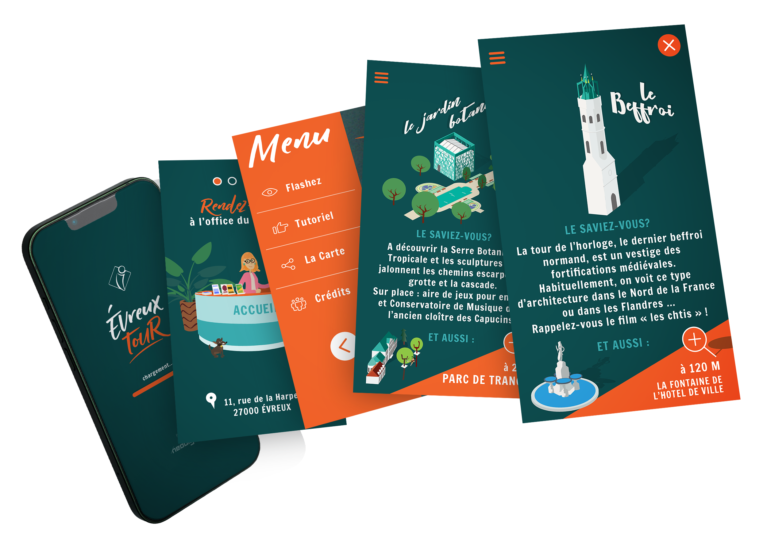 Nous avons conçu pour la ville d’Évreux un projet innovant : une carte XXL augmentée qui dévoile les secrets du territoire grâce à la réalité augmentée. En utilisant un smartphone ou une tablette, habitants et visiteurs peuvent explorer Évreux sous un nouveau jour, découvrant des informations inédites et des anecdotes passionnantes en superposant le passé et le présent. Cette carte interactive renforce l’attractivité du territoire en mettant en valeur son patrimoine, ses lieux emblématiques, et ses trésors cachés. Elle offre une expérience interactive unique qui invite à redécouvrir Évreux, enrichissant ainsi l’expérience des habitants et captivant les touristes.