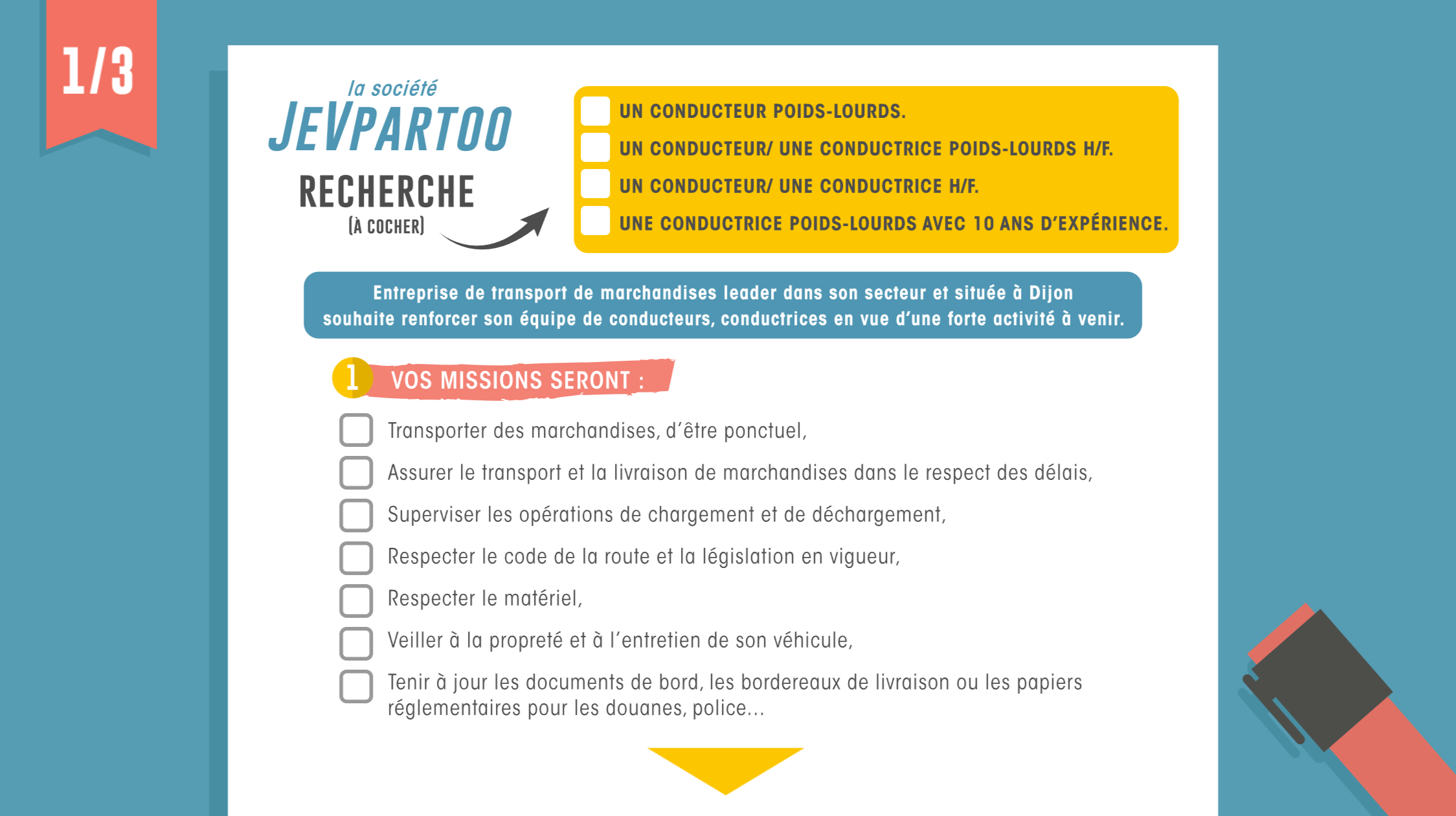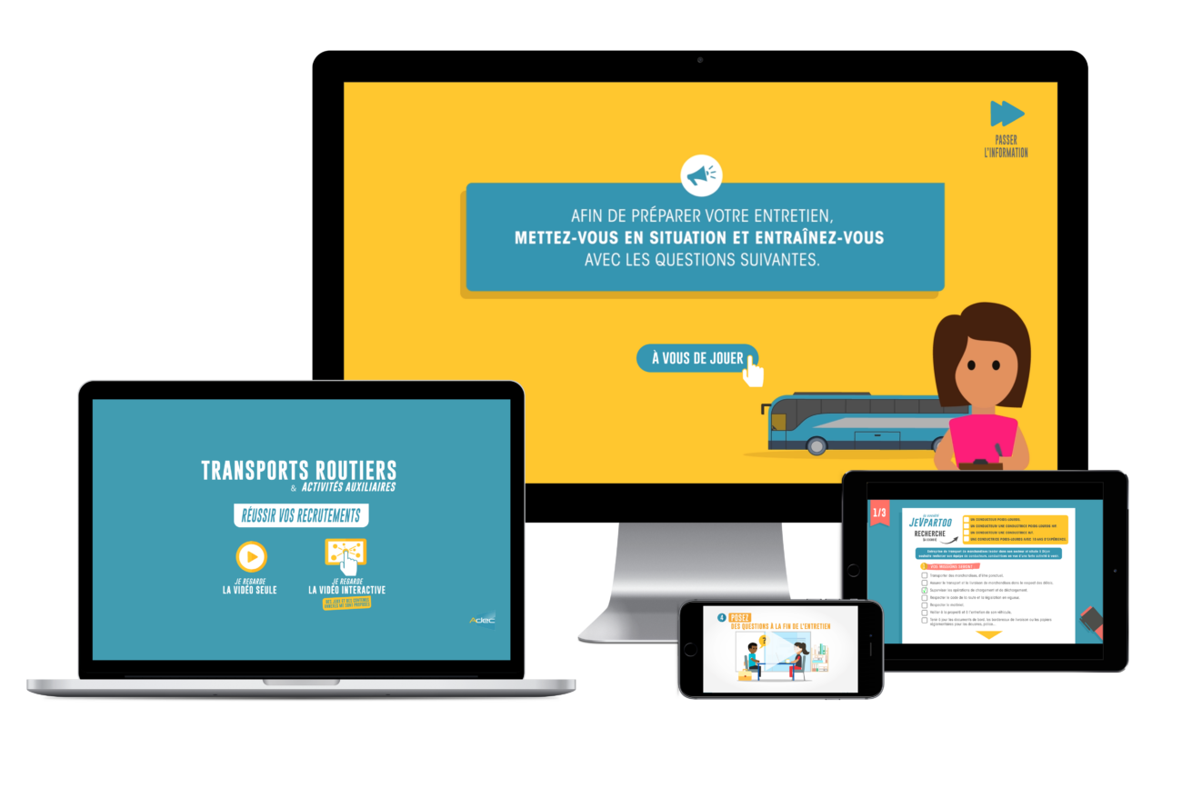 Le client souhaitait créer un outil de formation interactif capable de répondre à un double enjeu : renforcer l’employabilité des candidats tout en valorisant les spécificités du secteur du transport routier et de ses activités auxiliaires. L’objectif était de concevoir un dispositif pédagogique clair, attractif et accessible, permettant aux demandeurs d’emploi de mieux comprendre les opportunités du secteur, d’acquérir les compétences attendues et de se préparer efficacement aux démarches de recrutement.